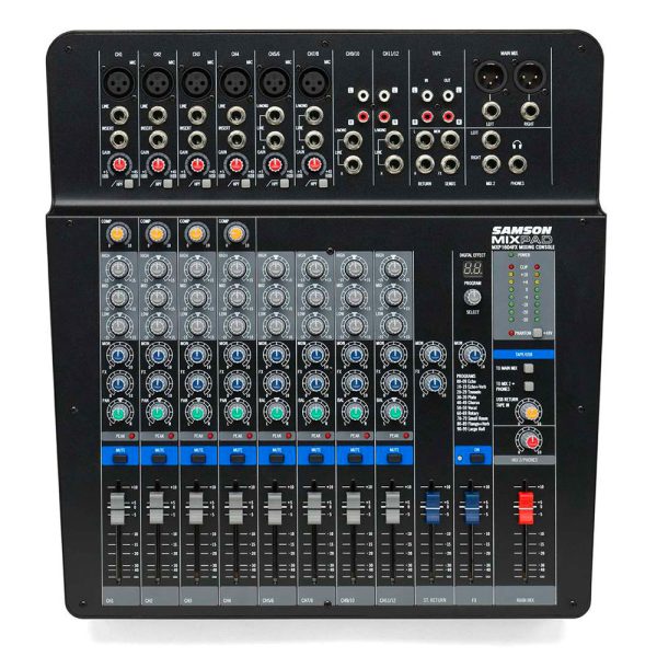 6 ingressi mic/line mono, 2 ingressi stereo RCA – Equalizzatore a 3 bande su tutti i canali – 4 canali stereo con controllo di balance, filtro passa alto – 4 canali mono con Pan, Gain, filtro passa alto e compressore dedicato – 99 effetti digitali con controllo dedicato per ogni canale – Porta USB per streaming audio – Connessioni Send e Return mono e stereo – Porta USB – Uscita RCA – Uscita cuffie con volume dedicato – Phantom Power – VU meter LED a 8 step