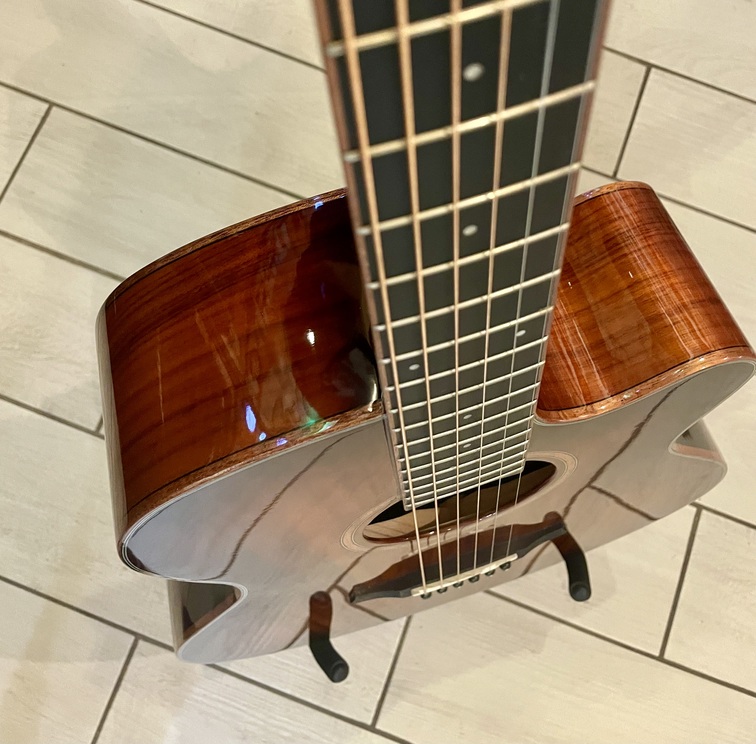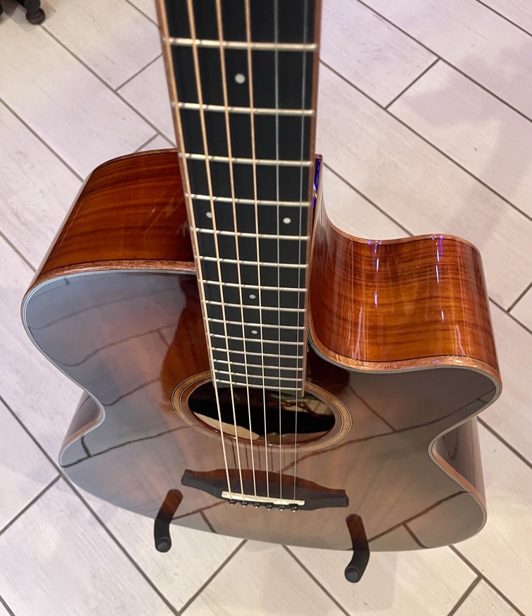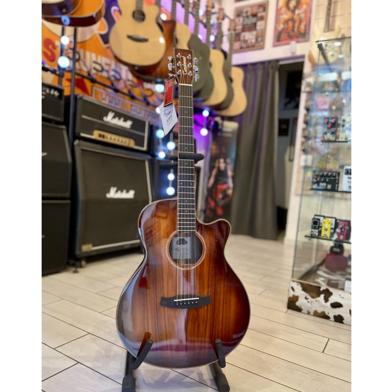 Corpo super folk cutaway – Piano armonico in koa massello – Fondo e fasce in koa – Manico in mogano – Capotasto da 43mm – Scala 650mm – Tastiera in eboncore – Ponticello in Techwood – Hardware cromato – Elettronica Fishman Presys – Corde Elixir Nanoweb 12-53 – custodia non inclusa